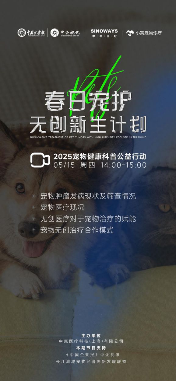 5月15日,由中惠医疗科技(上海)有限公司主办、《中国企业报》中企视讯及长江流域宠物经济创新发展联盟支持的“春日宠护·无创新生计划”2025宠物健康